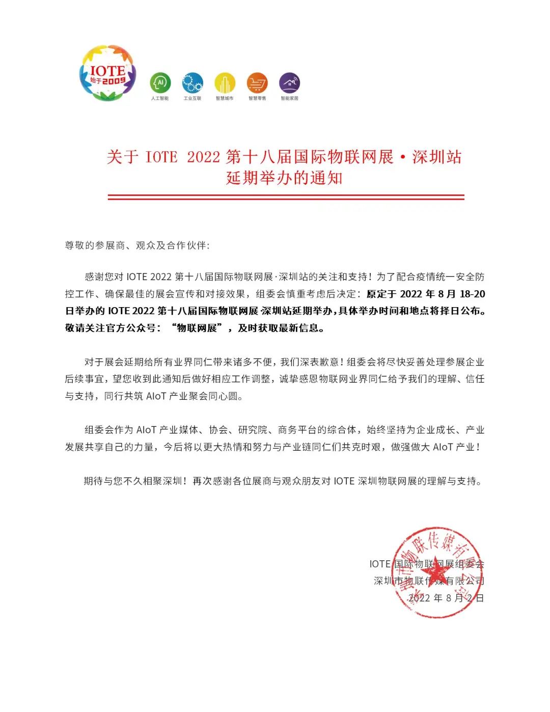 關(guān)于IOTE 2022 第十八屆國際物聯(lián)網(wǎng)展·深圳站延期舉辦的通知
